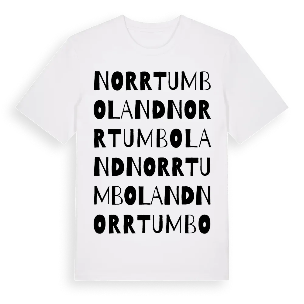 Norrtumboland ordlek t-shirt är inspirerad av Norrtumboland i Uppsala län, Sverige. Tröjan är designad för dig som har en speciell koppling till platsen – oavsett om du bor här, har rötterna här eller bara älskar Norrtumboland.