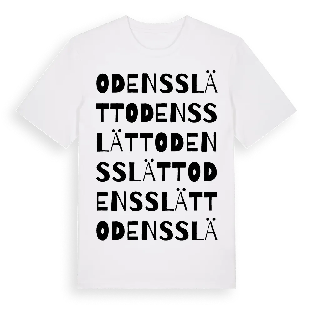 Odensslätt ordlek t-shirt är inspirerad av byn Odensslätt i Uppsala län, Sverige. Tröjan är designad för dig som har en speciell koppling till platsen – oavsett om du bor här, har rötterna här eller bara älskar Odensslätt.