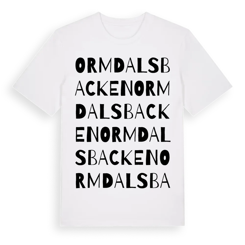 Ormdalsbacken ordlek t-shirt är inspirerad av Ormdalsbacken i Uppsala län, Sverige. Tröjan är designad för dig som har en speciell koppling till platsen – oavsett om du bor här, har rötterna här eller bara älskar Ormdalsbacken.