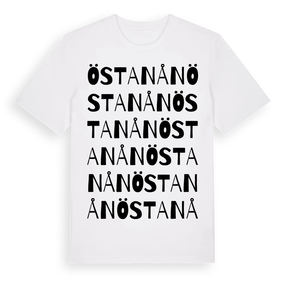 Östanån ordlek t-shirt är inspirerad av stadsdelen Östanån i Uppsala län, Sverige. Tröjan är designad för dig som har en speciell koppling till platsen – oavsett om du bor här, har rötterna här eller bara älskar Östanån.