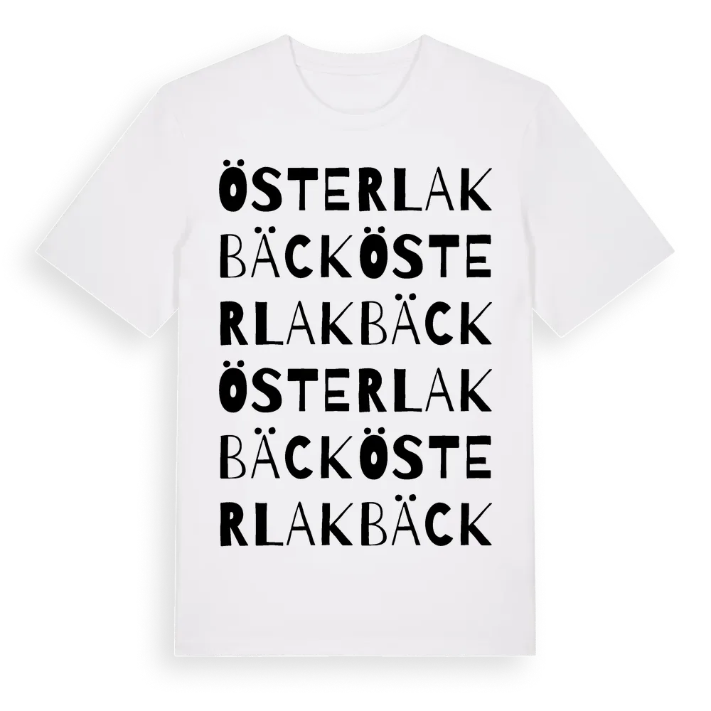 Öster Lakbäck ordlek t-shirt är inspirerad av byn Öster Lakbäck i Uppsala län, Sverige. Tröjan är designad för dig som har en speciell koppling till platsen – oavsett om du bor här, har rötterna här eller bara älskar Öster Lakbäck.
