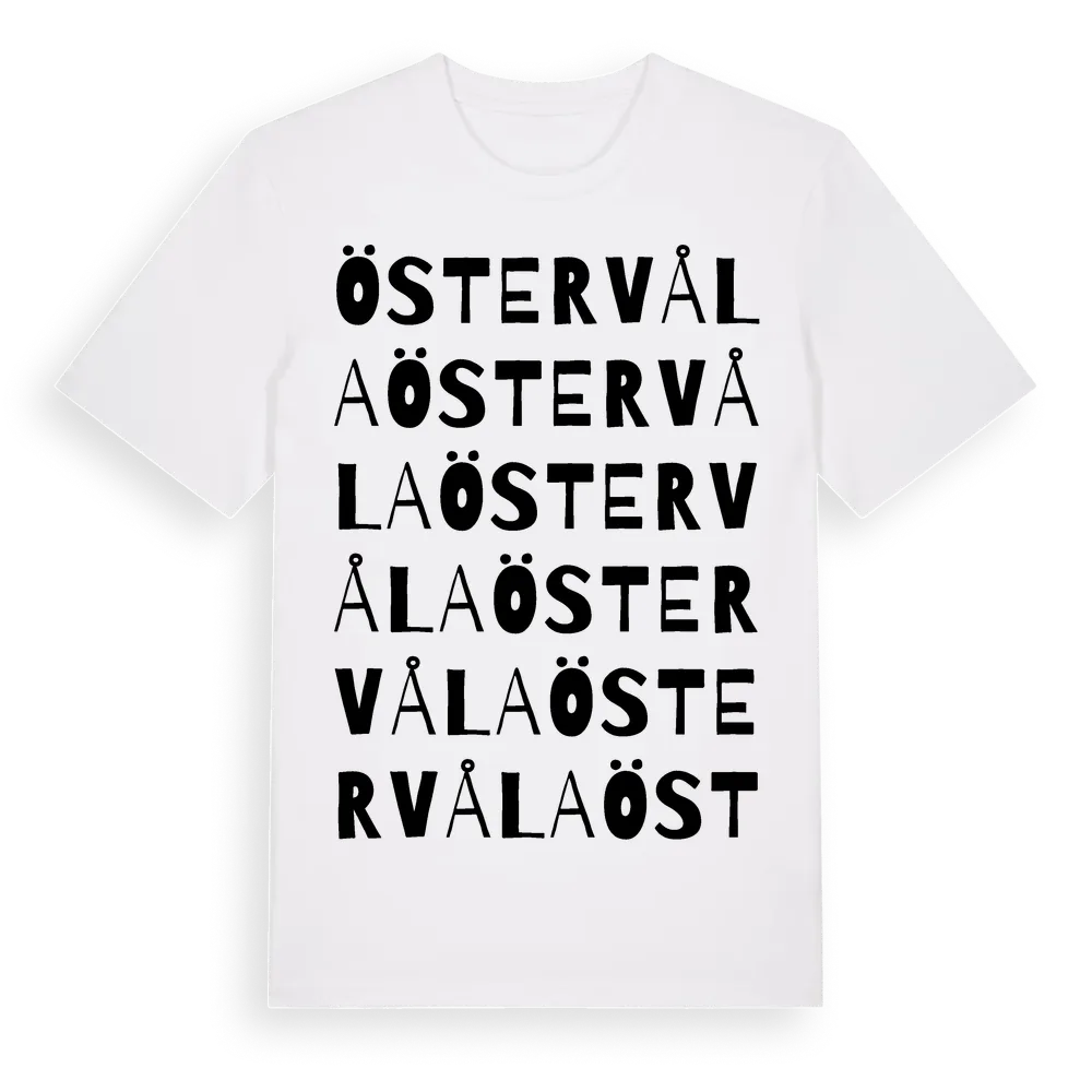 Östervåla ordlek t-shirt är inspirerad av byn Östervåla i Uppsala län, Sverige. Tröjan är designad för dig som har en speciell koppling till platsen – oavsett om du bor här, har rötterna här eller bara älskar Östervåla.
