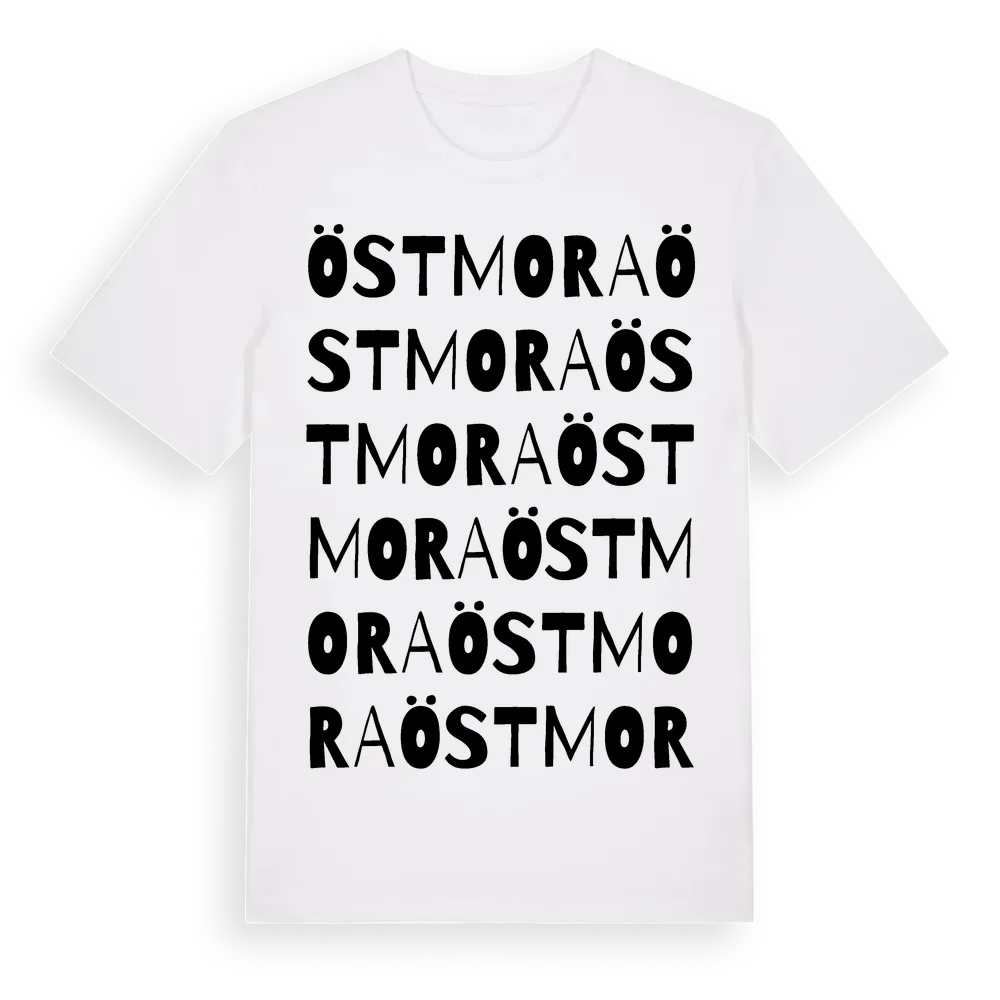 Östmora ordlek t-shirt är inspirerad av Östmora i Uppsala län, Sverige. Tröjan är designad för dig som har en speciell koppling till platsen – oavsett om du bor här, har rötterna här eller bara älskar Östmora.
