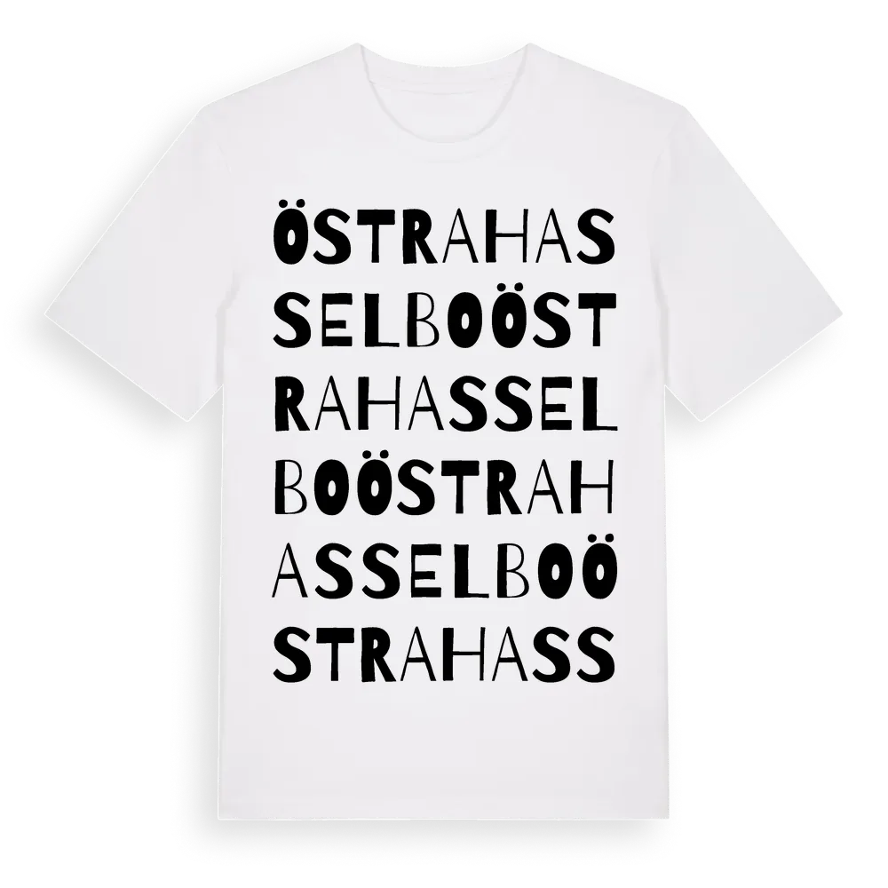 Östra Hasselbo ordlek t-shirt är inspirerad av Östra Hasselbo i Uppsala län, Sverige. Tröjan är designad för dig som har en speciell koppling till platsen – oavsett om du bor här, har rötterna här eller bara älskar Östra Hasselbo.