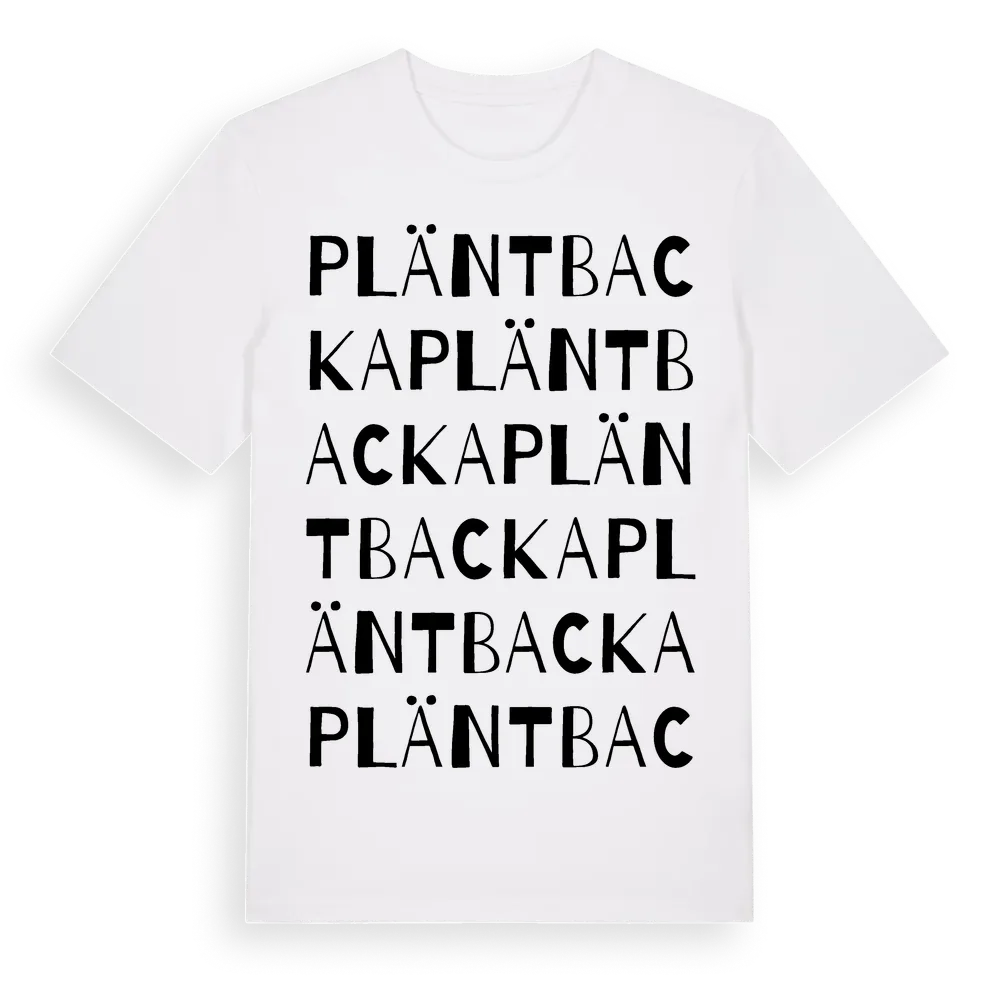 Pläntbacka ordlek t-shirt är inspirerad av Pläntbacka i Uppsala län, Sverige. Tröjan är designad för dig som har en speciell koppling till platsen – oavsett om du bor här, har rötterna här eller bara älskar Pläntbacka.