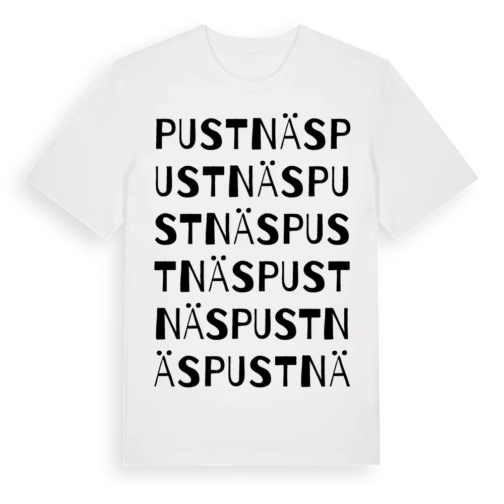 Pustnäs ordlek t-shirt är inspirerad av byn Pustnäs i Uppsala län, Sverige. Tröjan är designad för dig som har en speciell koppling till platsen – oavsett om du bor här, har rötterna här eller bara älskar Pustnäs.