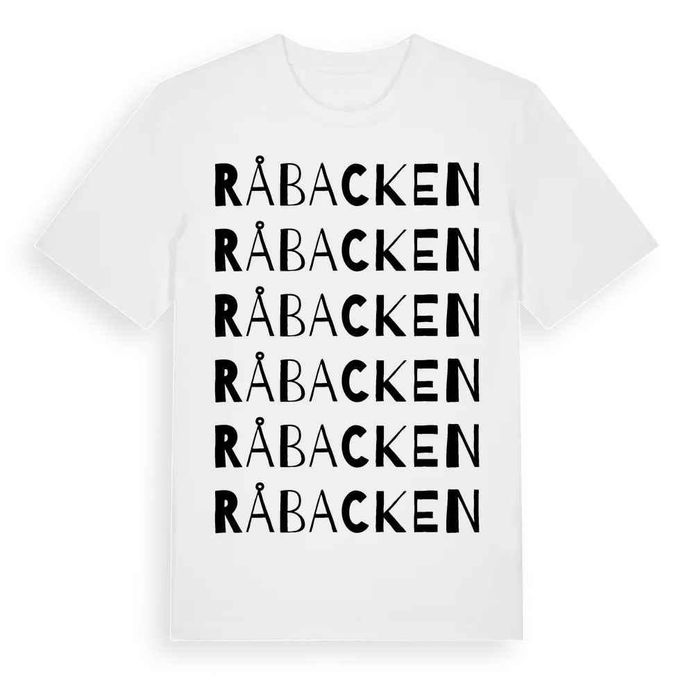 Råbacken ordlek t-shirt är inspirerad av Råbacken i Uppsala län, Sverige. Tröjan är designad för dig som har en speciell koppling till platsen – oavsett om du bor här, har rötterna här eller bara älskar Råbacken.