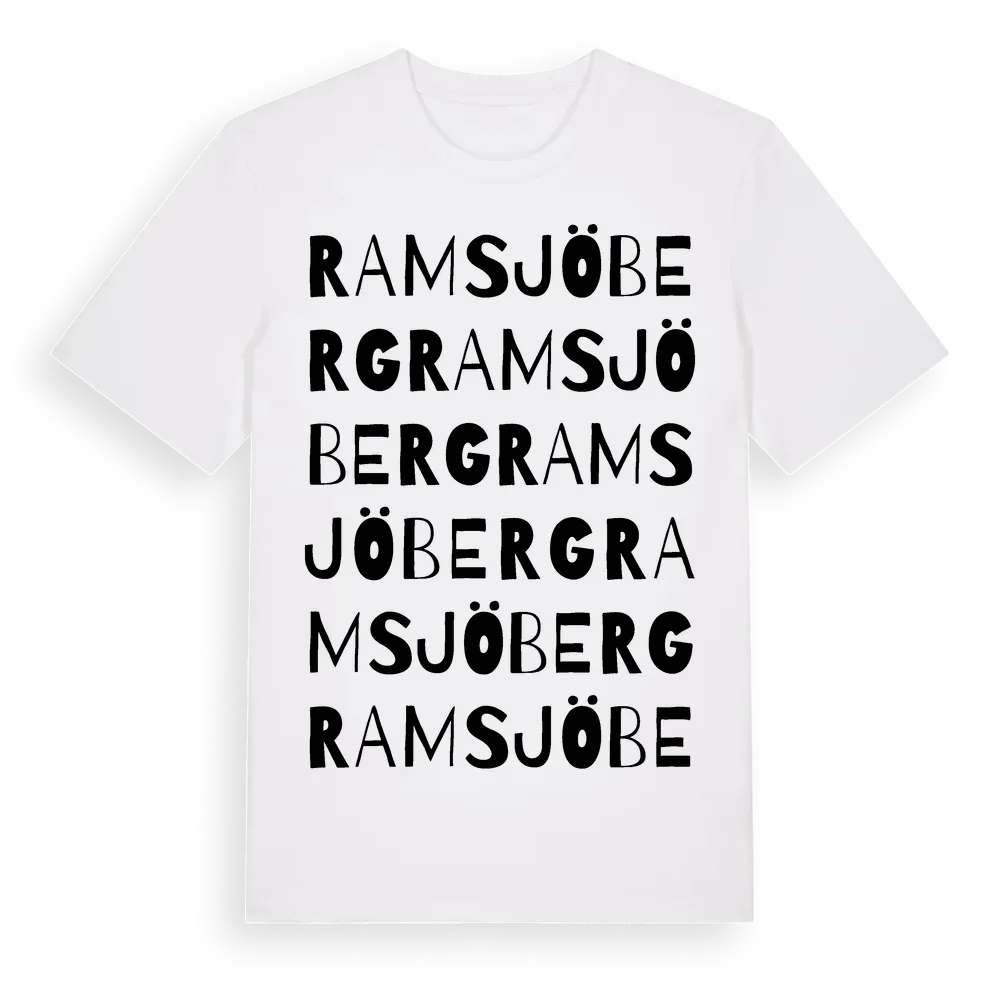 Ramsjöberg ordlek t-shirt är inspirerad av Ramsjöberg i Uppsala län, Sverige. Tröjan är designad för dig som har en speciell koppling till platsen – oavsett om du bor här, har rötterna här eller bara älskar Ramsjöberg.
