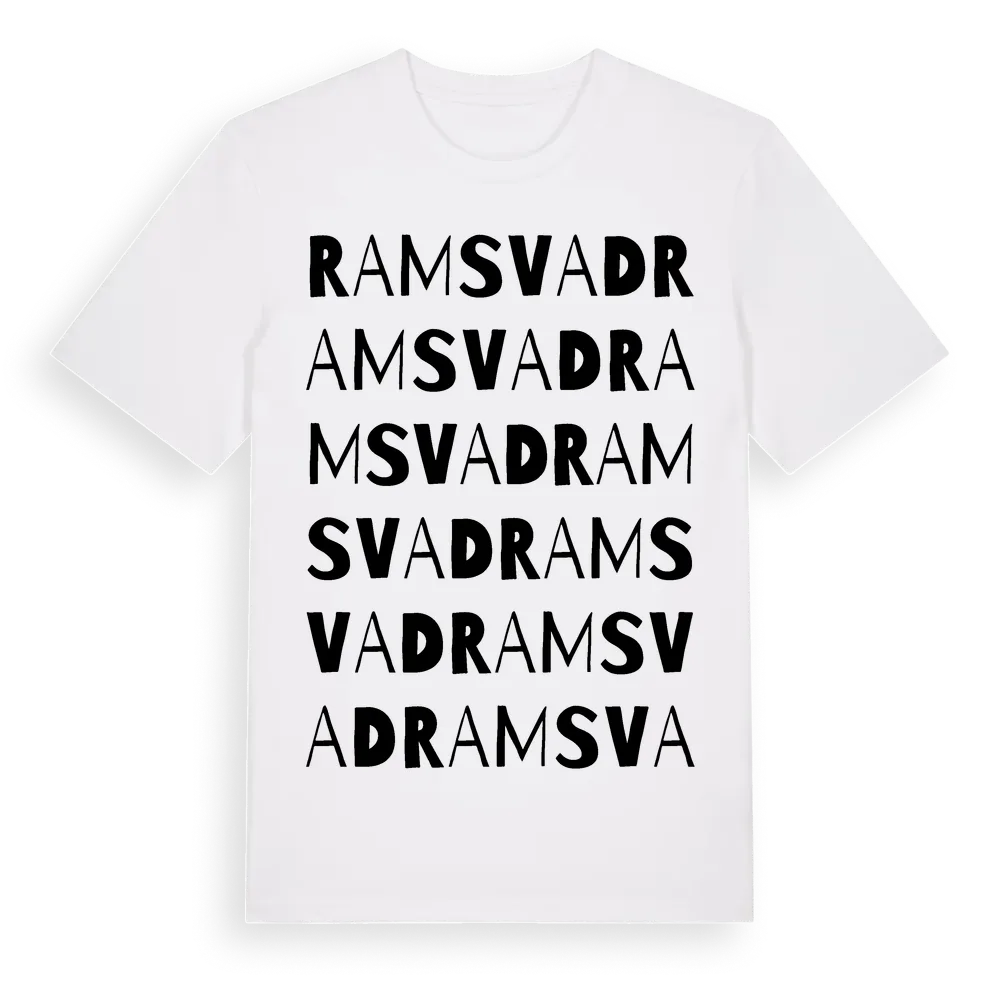 Ramsvad ordlek t-shirt är inspirerad av Ramsvad i Uppsala län, Sverige. Tröjan är designad för dig som har en speciell koppling till platsen – oavsett om du bor här, har rötterna här eller bara älskar Ramsvad.