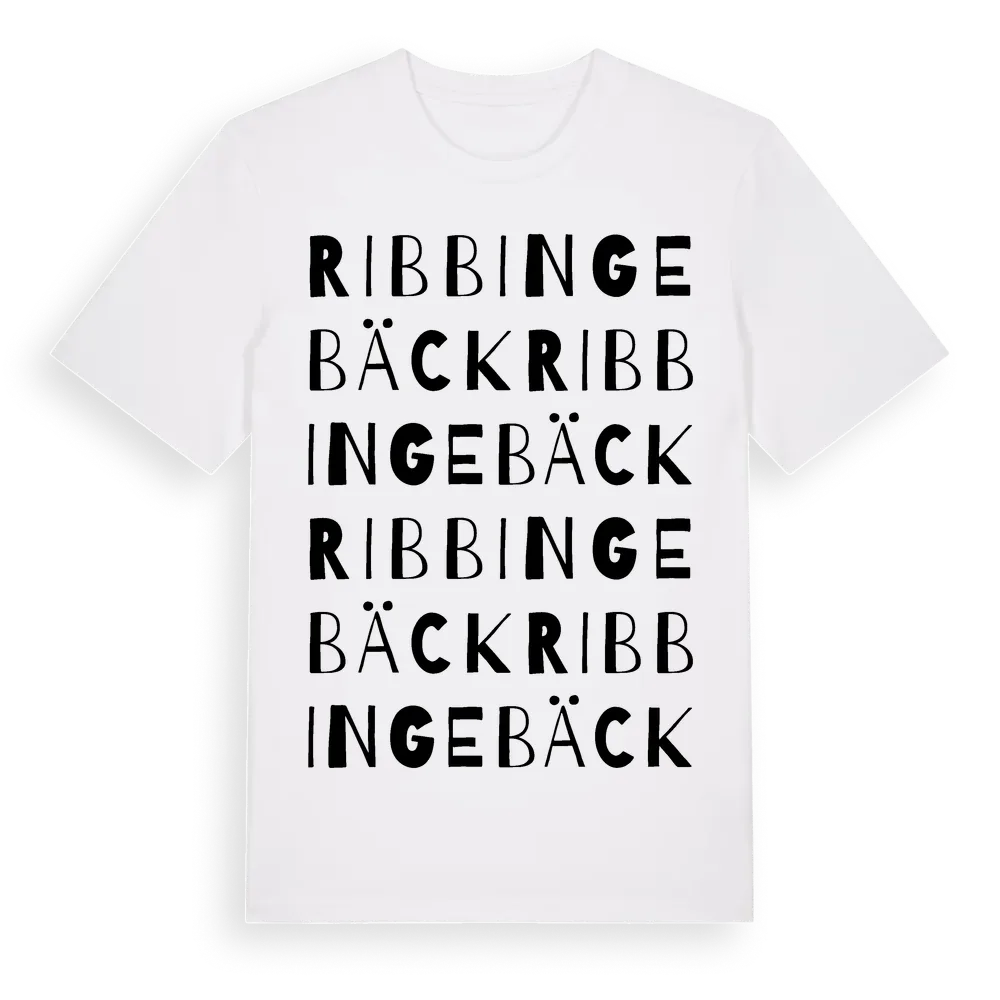 En ordlek byggd på Ribbingebäcks namn. Subtilt och klurig – ett motiv som bara de som verkligen känner platsen fullt ut förstår. Premium bomull, unisex – från byn Ribbingebäck i Uppsala län.