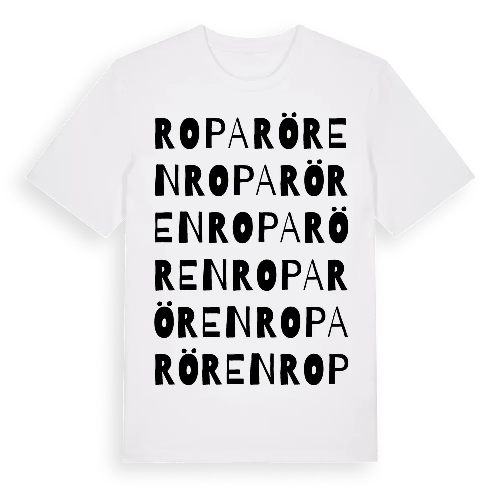 Roparören ordlek t-shirt är inspirerad av Roparören i Uppsala län, Sverige. Tröjan är designad för dig som har en speciell koppling till platsen – oavsett om du bor här, har rötterna här eller bara älskar Roparören.