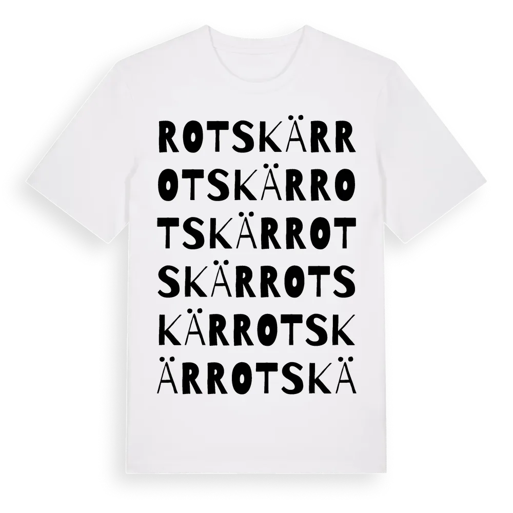 Rotskär ordlek t-shirt är inspirerad av stadsdelen Rotskär i Uppsala län, Sverige. Tröjan är designad för dig som har en speciell koppling till platsen – oavsett om du bor här, har rötterna här eller bara älskar Rotskär.