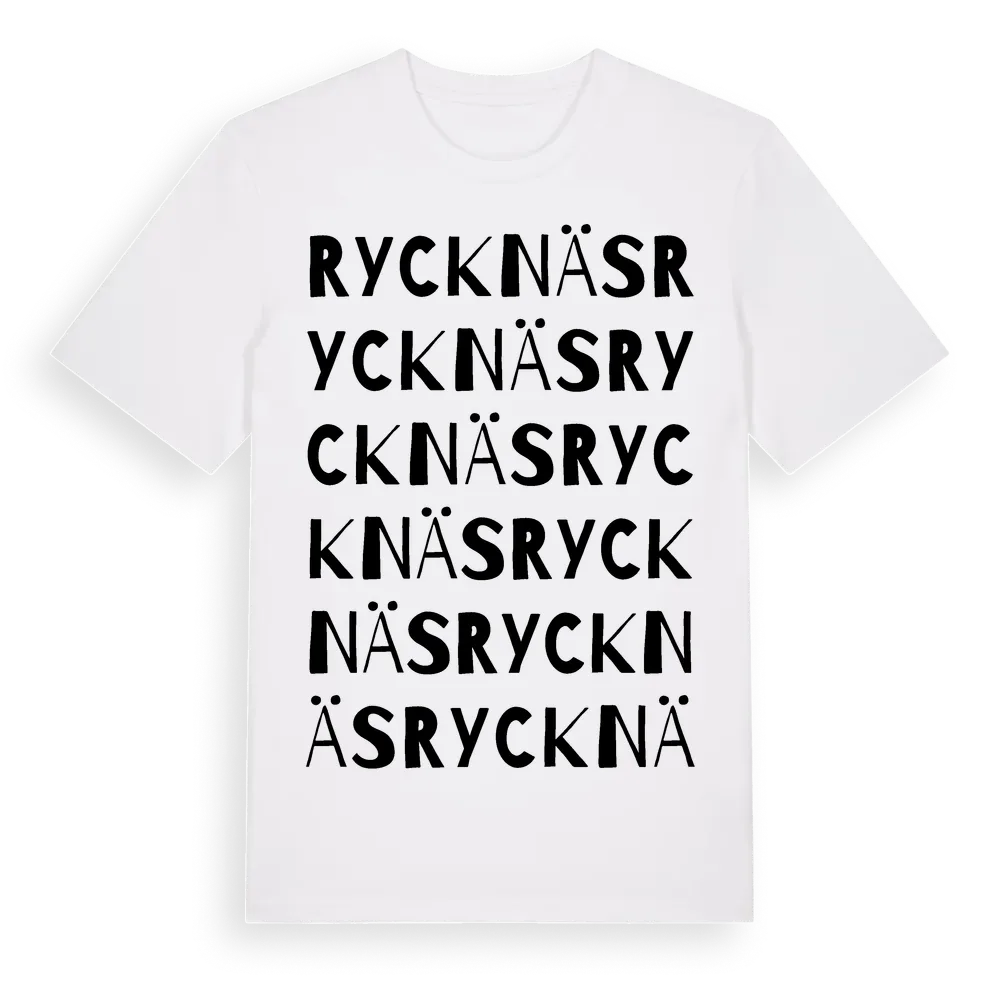 En ordlek byggd på Rycknäss namn. Subtilt och klurig – ett motiv som bara de som verkligen känner platsen fullt ut förstår. Premium bomull, unisex – från Rycknäs i Uppsala län.