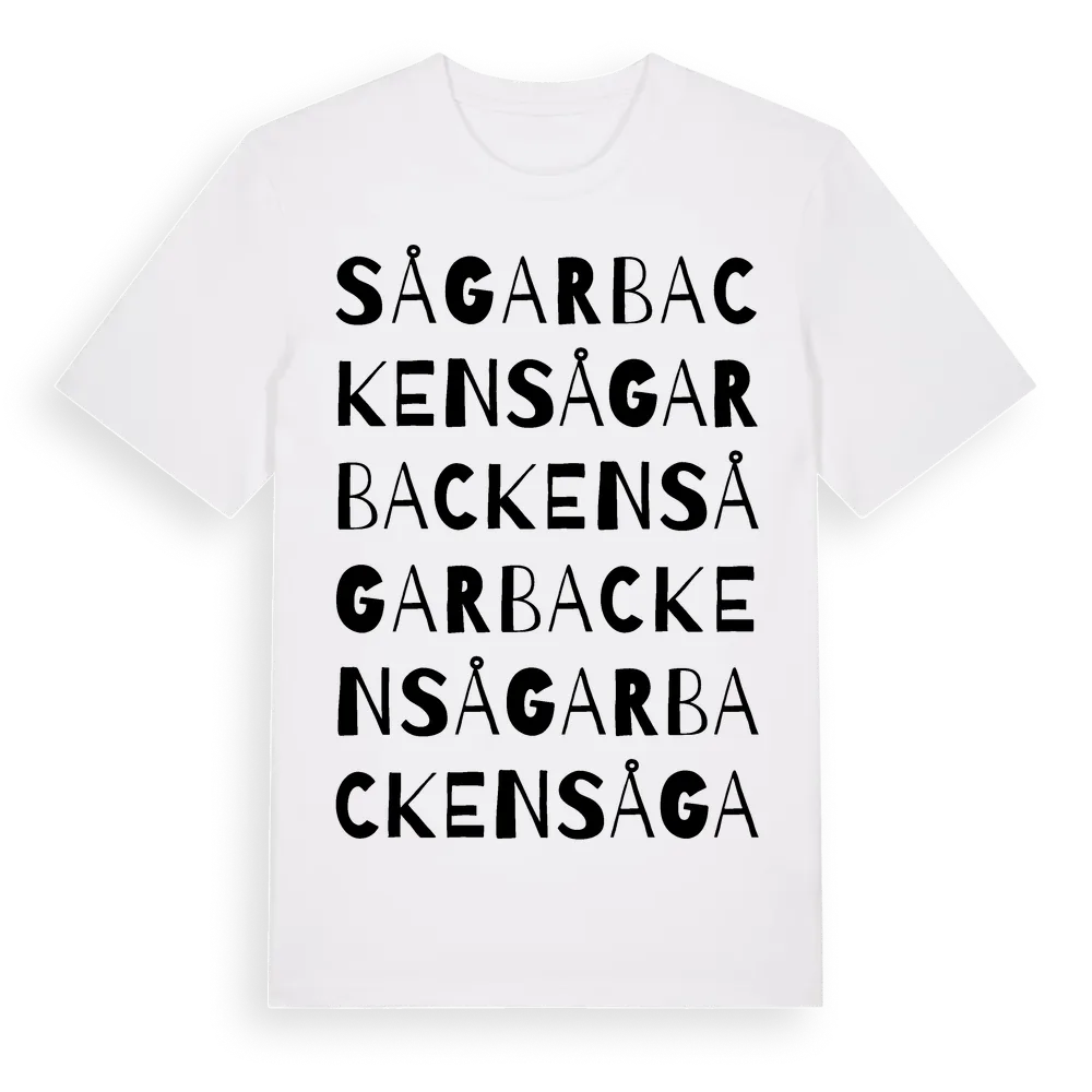 Sågarbacken ordlek t-shirt är inspirerad av stadsdelen Sågarbacken i Uppsala län, Sverige. Tröjan är designad för dig som har en speciell koppling till platsen – oavsett om du bor här, har rötterna här eller bara älskar Sågarbacken.