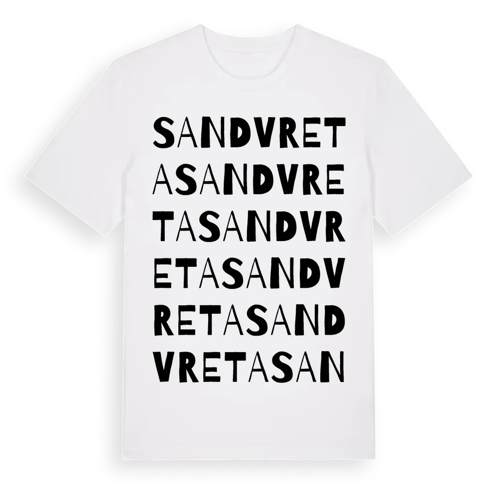 Sandvreta ordlek t-shirt är inspirerad av Sandvreta i Uppsala län, Sverige. Tröjan är designad för dig som har en speciell koppling till platsen – oavsett om du bor här, har rötterna här eller bara älskar Sandvreta.