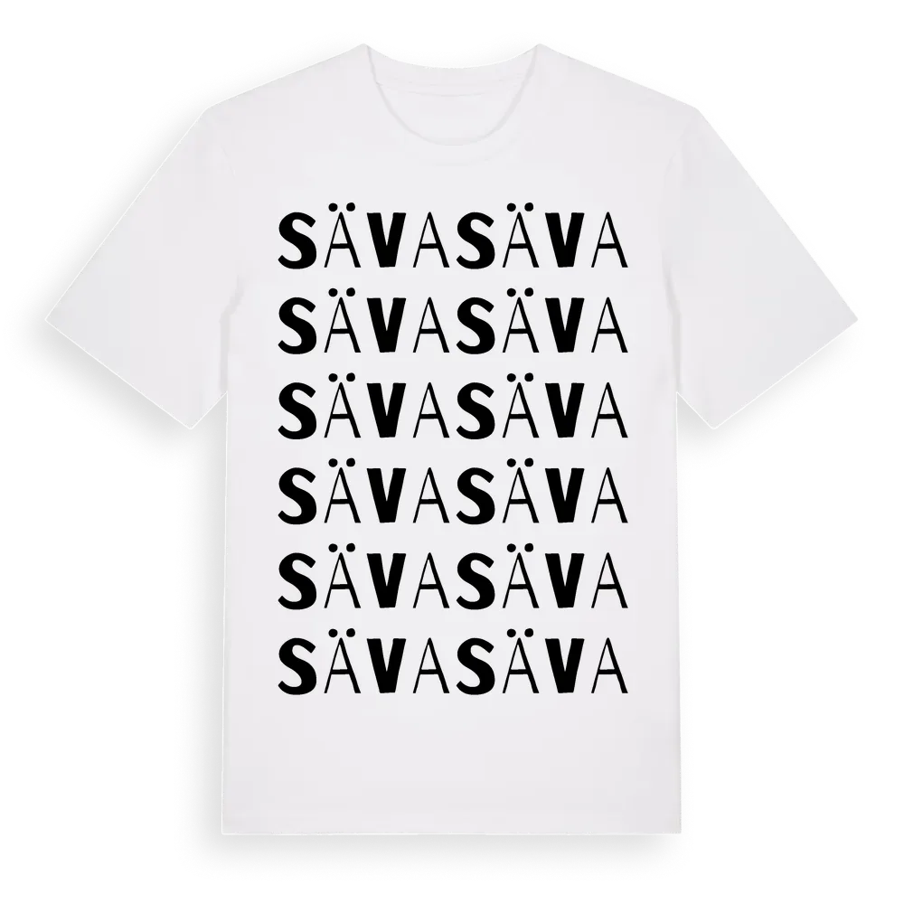 Säva ordlek t-shirt är inspirerad av byn Säva i Uppsala län, Sverige. Tröjan är designad för dig som har en speciell koppling till platsen – oavsett om du bor här, har rötterna här eller bara älskar Säva.