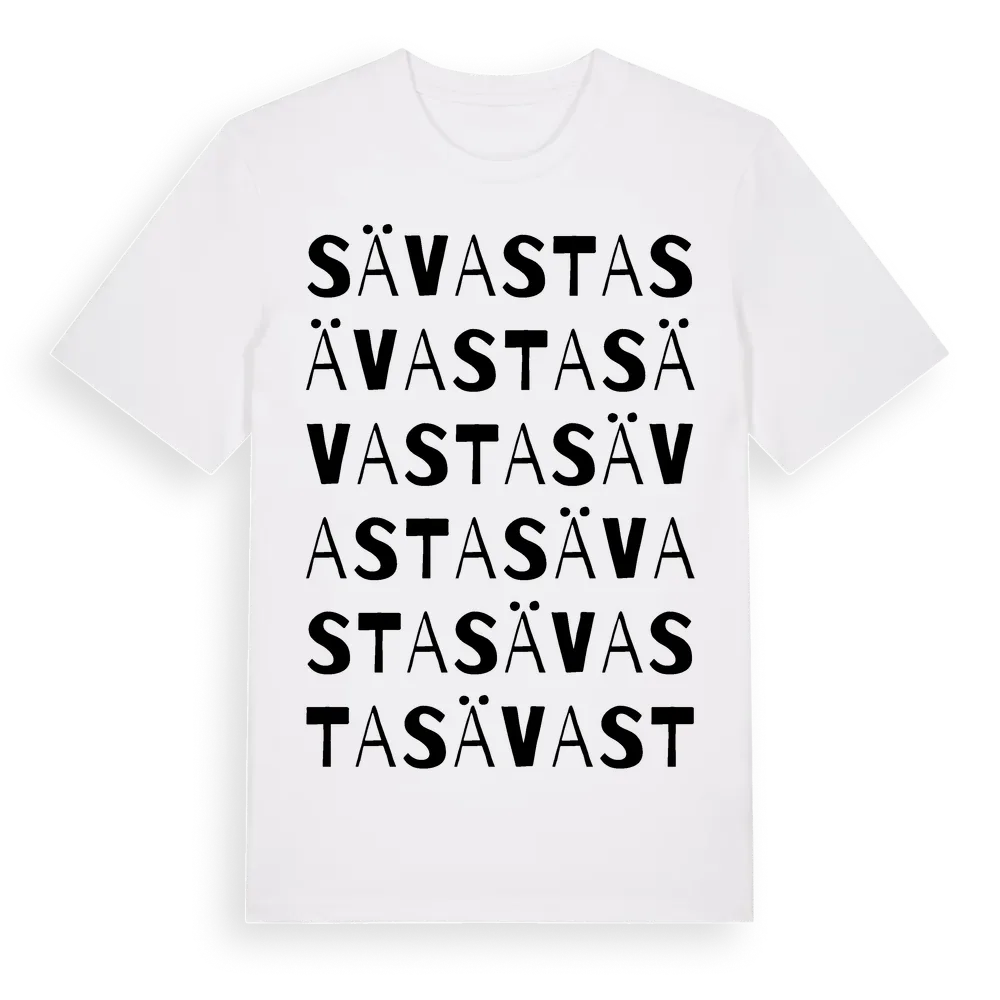 Sävasta ordlek t-shirt är inspirerad av byn Sävasta i Uppsala län, Sverige. Tröjan är designad för dig som har en speciell koppling till platsen – oavsett om du bor här, har rötterna här eller bara älskar Sävasta.