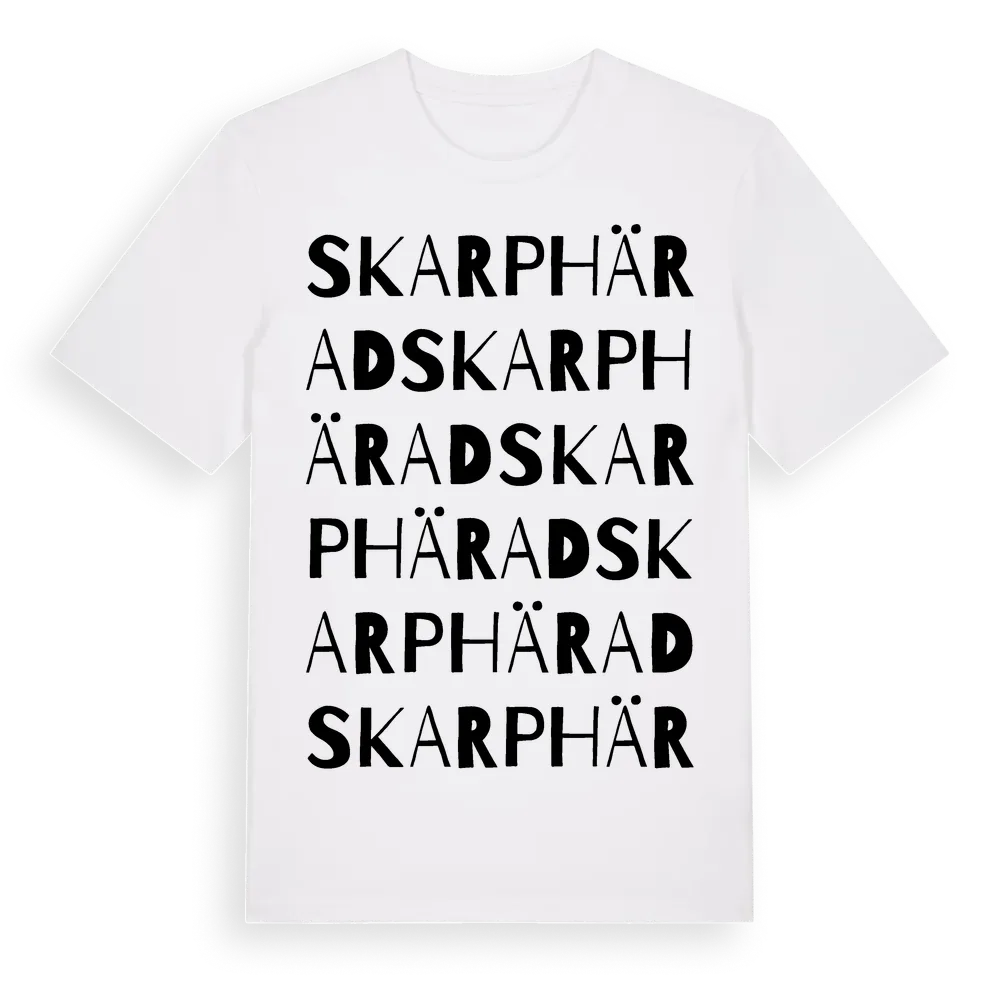 Skarphärad ordlek t-shirt är inspirerad av Skarphärad i Uppsala län, Sverige. Tröjan är designad för dig som har en speciell koppling till platsen – oavsett om du bor här, har rötterna här eller bara älskar Skarphärad.