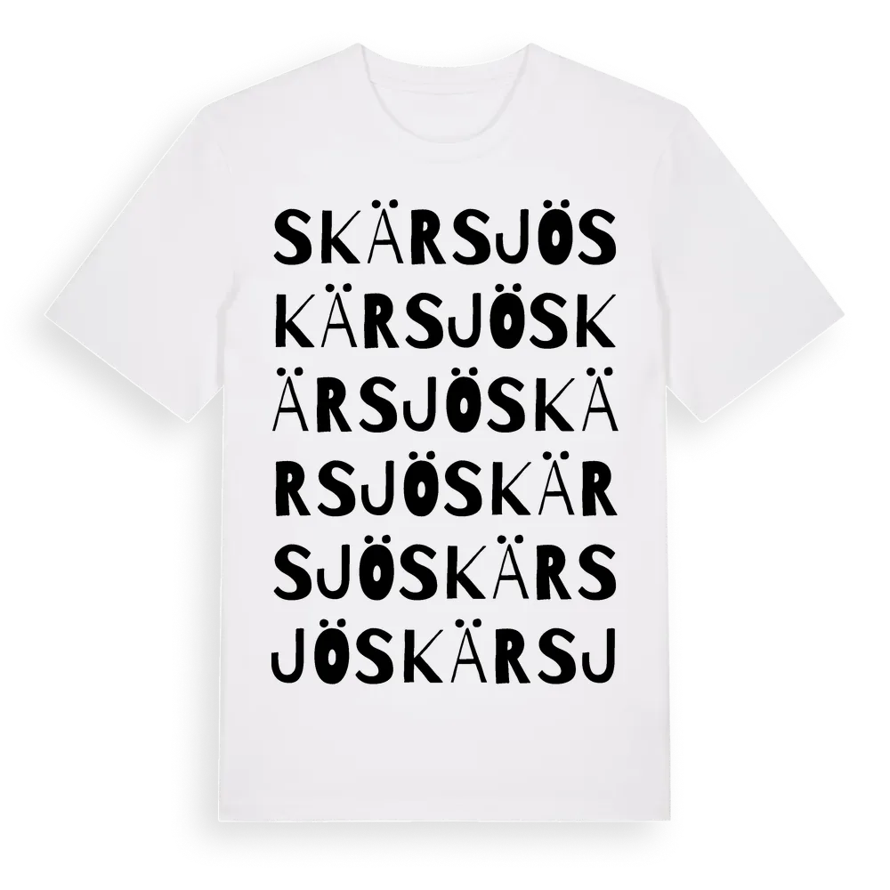 Skärsjö ordlek t-shirt är inspirerad av byn Skärsjö i Uppsala län, Sverige. Tröjan är designad för dig som har en speciell koppling till platsen – oavsett om du bor här, har rötterna här eller bara älskar Skärsjö.