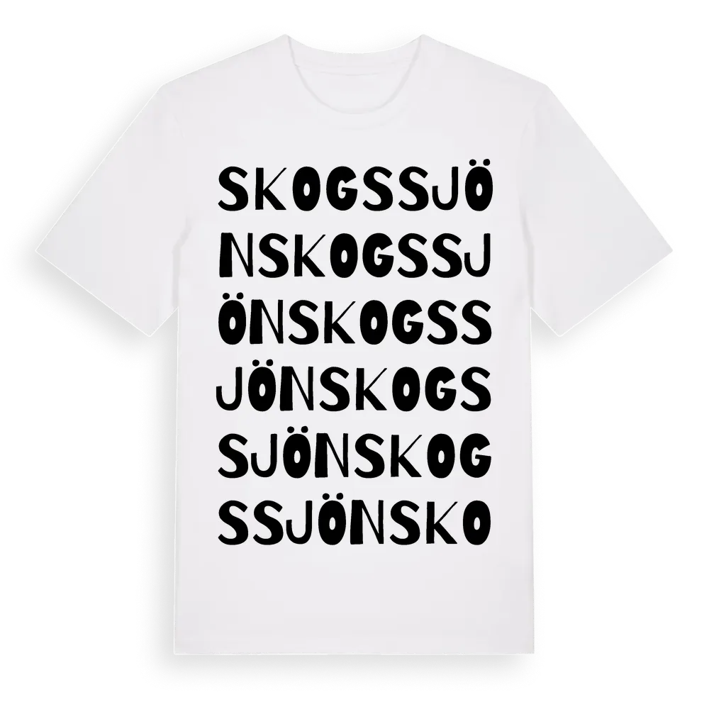 Skogssjön ordlek t-shirt är inspirerad av Skogssjön i Uppsala län, Sverige. Tröjan är designad för dig som har en speciell koppling till platsen – oavsett om du bor här, har rötterna här eller bara älskar Skogssjön.