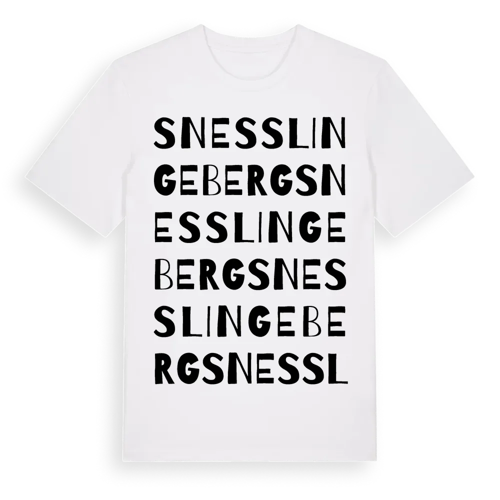 Snesslinge Berg ordlek t-shirt är inspirerad av byn Snesslinge Berg i Uppsala län, Sverige. Tröjan är designad för dig som har en speciell koppling till platsen – oavsett om du bor här, har rötterna här eller bara älskar Snesslinge Berg.