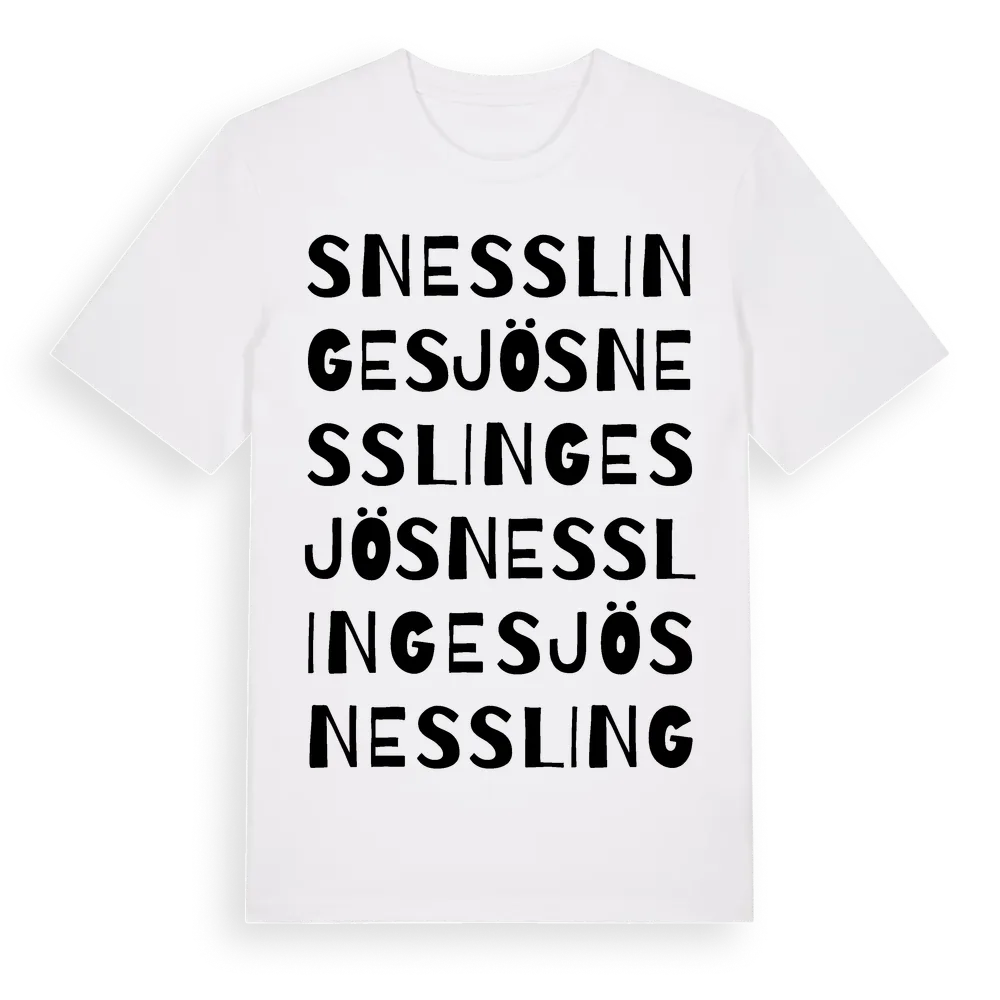Snesslingesjö ordlek t-shirt är inspirerad av byn Snesslingesjö i Uppsala län, Sverige. Tröjan är designad för dig som har en speciell koppling till platsen – oavsett om du bor här, har rötterna här eller bara älskar Snesslingesjö.