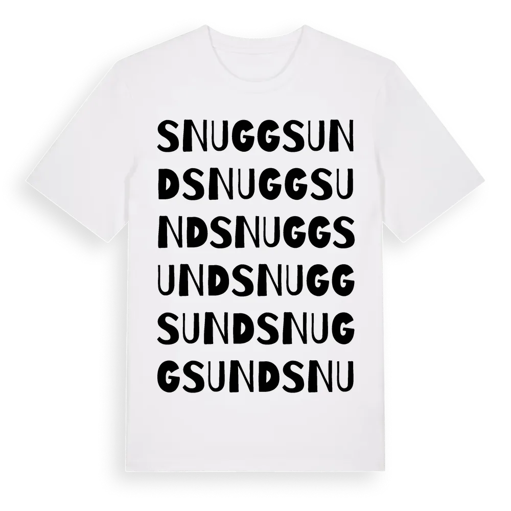 Snuggsund ordlek t-shirt är inspirerad av byn Snuggsund i Uppsala län, Sverige. Tröjan är designad för dig som har en speciell koppling till platsen – oavsett om du bor här, har rötterna här eller bara älskar Snuggsund.