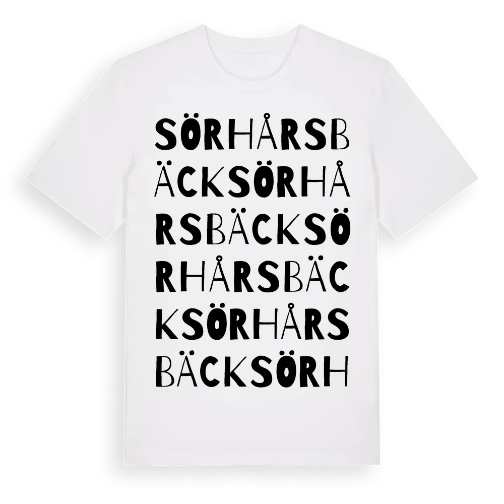 Sör Hårsbäck ordlek t-shirt är inspirerad av byn Sör Hårsbäck i Uppsala län, Sverige. Tröjan är designad för dig som har en speciell koppling till platsen – oavsett om du bor här, har rötterna här eller bara älskar Sör Hårsbäck.