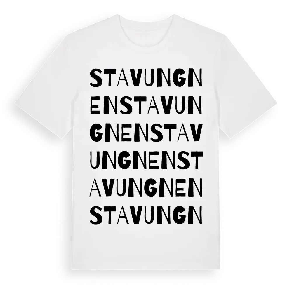 Stavungnen ordlek t-shirt är inspirerad av Stavungnen i Uppsala län, Sverige. Tröjan är designad för dig som har en speciell koppling till platsen – oavsett om du bor här, har rötterna här eller bara älskar Stavungnen.