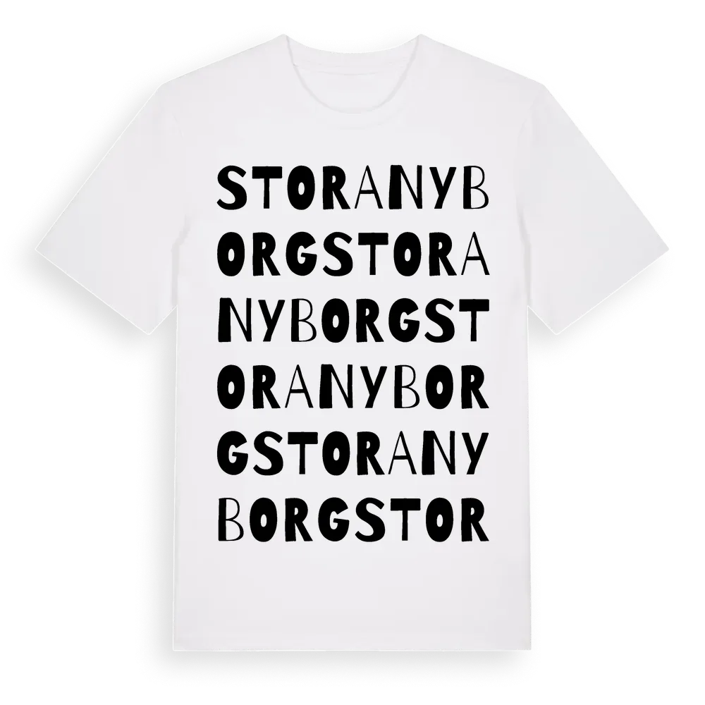 Stora Nyborg ordlek t-shirt är inspirerad av Stora Nyborg i Uppsala län, Sverige. Tröjan är designad för dig som har en speciell koppling till platsen – oavsett om du bor här, har rötterna här eller bara älskar Stora Nyborg.