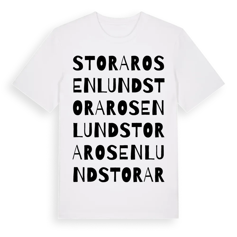 Stora Rosenlund ordlek t-shirt är inspirerad av Stora Rosenlund i Uppsala län, Sverige. Tröjan är designad för dig som har en speciell koppling till platsen – oavsett om du bor här, har rötterna här eller bara älskar Stora Rosenlund.