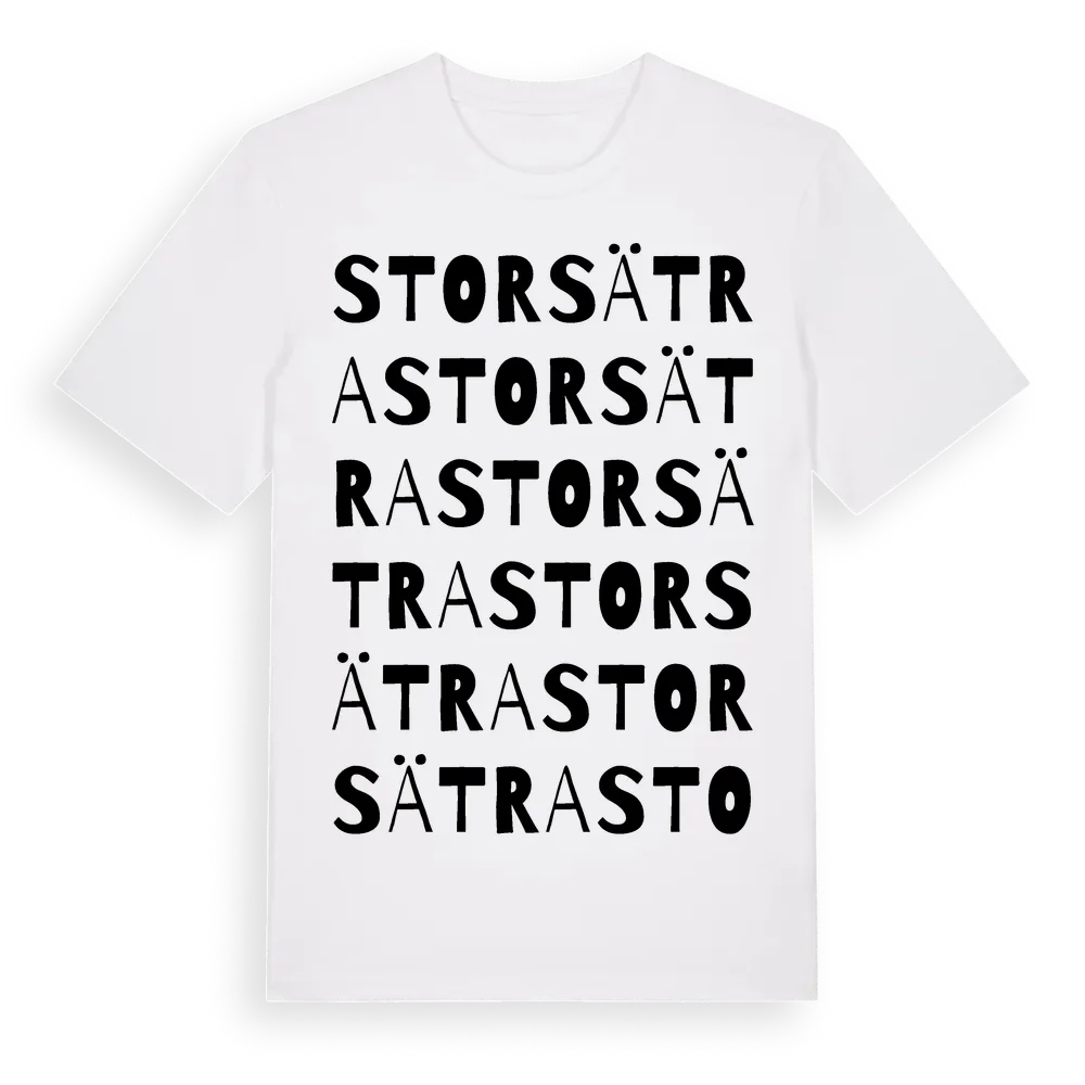 Storsätra ordlek t-shirt är inspirerad av Storsätra i Uppsala län, Sverige. Tröjan är designad för dig som har en speciell koppling till platsen – oavsett om du bor här, har rötterna här eller bara älskar Storsätra.