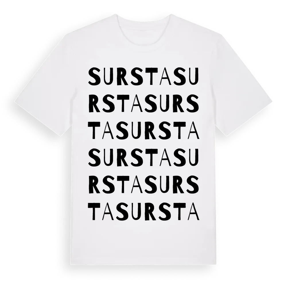 Sursta ordlek t-shirt är inspirerad av Sursta i Uppsala län, Sverige. Tröjan är designad för dig som har en speciell koppling till platsen – oavsett om du bor här, har rötterna här eller bara älskar Sursta.