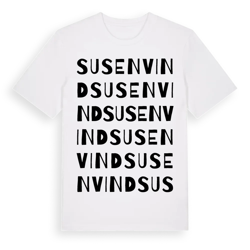 Susenvind ordlek t-shirt är inspirerad av Susenvind i Uppsala län, Sverige. Tröjan är designad för dig som har en speciell koppling till platsen – oavsett om du bor här, har rötterna här eller bara älskar Susenvind.