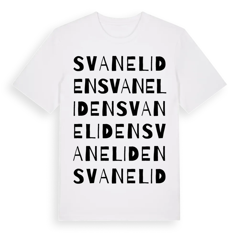 Svaneliden ordlek t-shirt är inspirerad av Svaneliden i Uppsala län, Sverige. Tröjan är designad för dig som har en speciell koppling till platsen – oavsett om du bor här, har rötterna här eller bara älskar Svaneliden.
