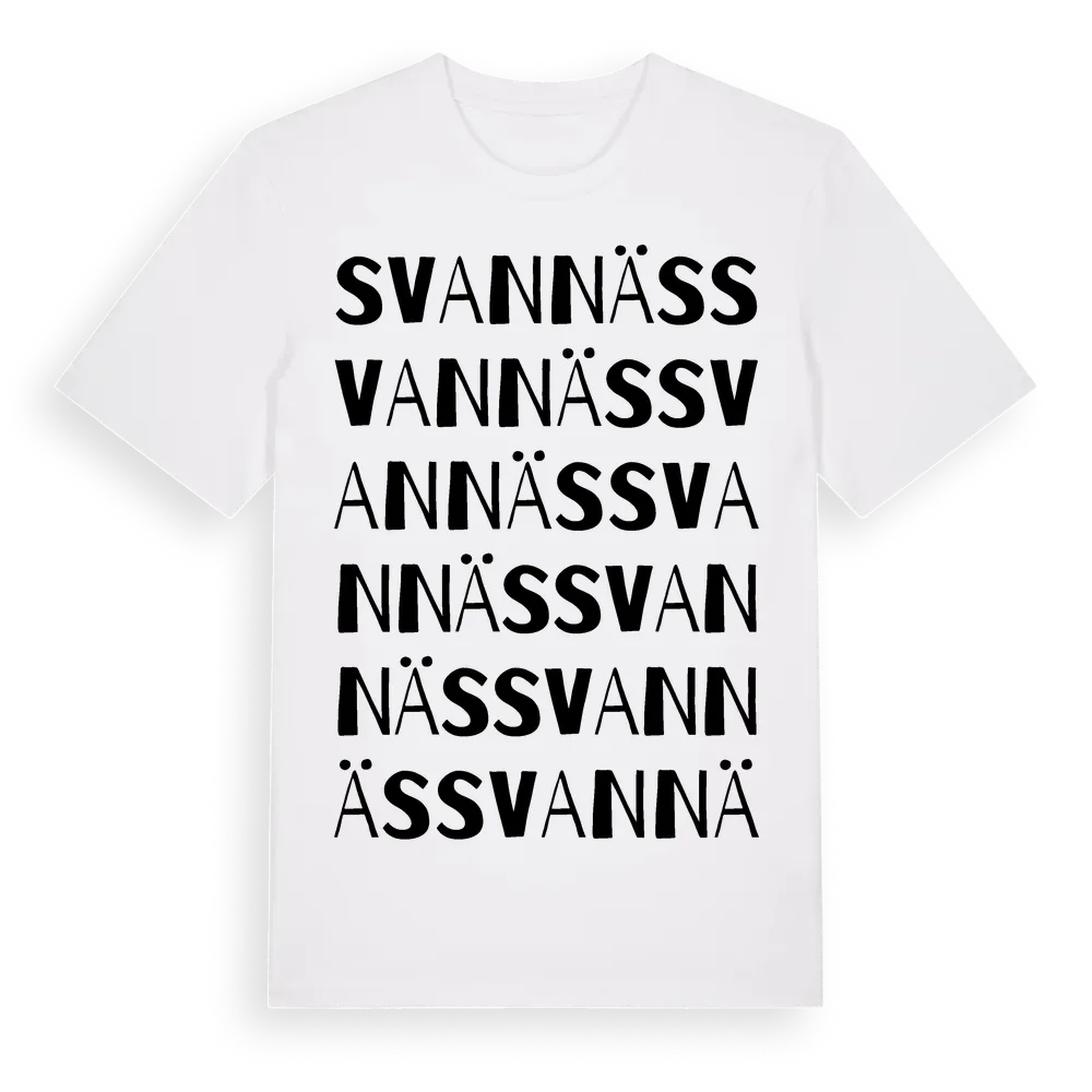 Svannäs ordlek t-shirt är inspirerad av Svannäs i Uppsala län, Sverige. Tröjan är designad för dig som har en speciell koppling till platsen – oavsett om du bor här, har rötterna här eller bara älskar Svannäs.