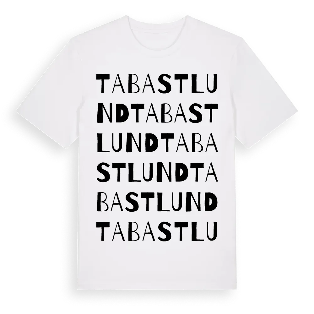 Tabastlund ordlek t-shirt är inspirerad av stadsdelen Tabastlund i Uppsala län, Sverige. Tröjan är designad för dig som har en speciell koppling till platsen – oavsett om du bor här, har rötterna här eller bara älskar Tabastlund.
