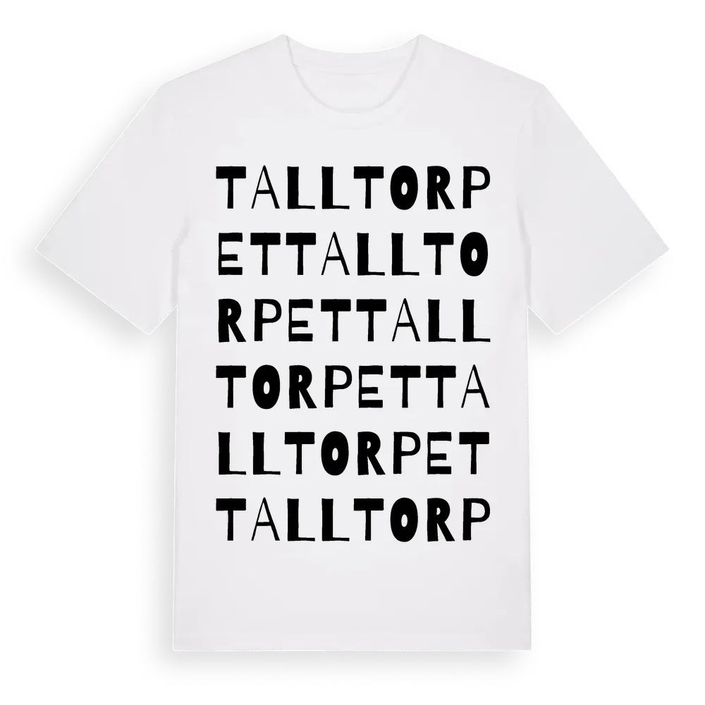 Talltorpet ordlek t-shirt är inspirerad av Talltorpet i Uppsala län, Sverige. Tröjan är designad för dig som har en speciell koppling till platsen – oavsett om du bor här, har rötterna här eller bara älskar Talltorpet.