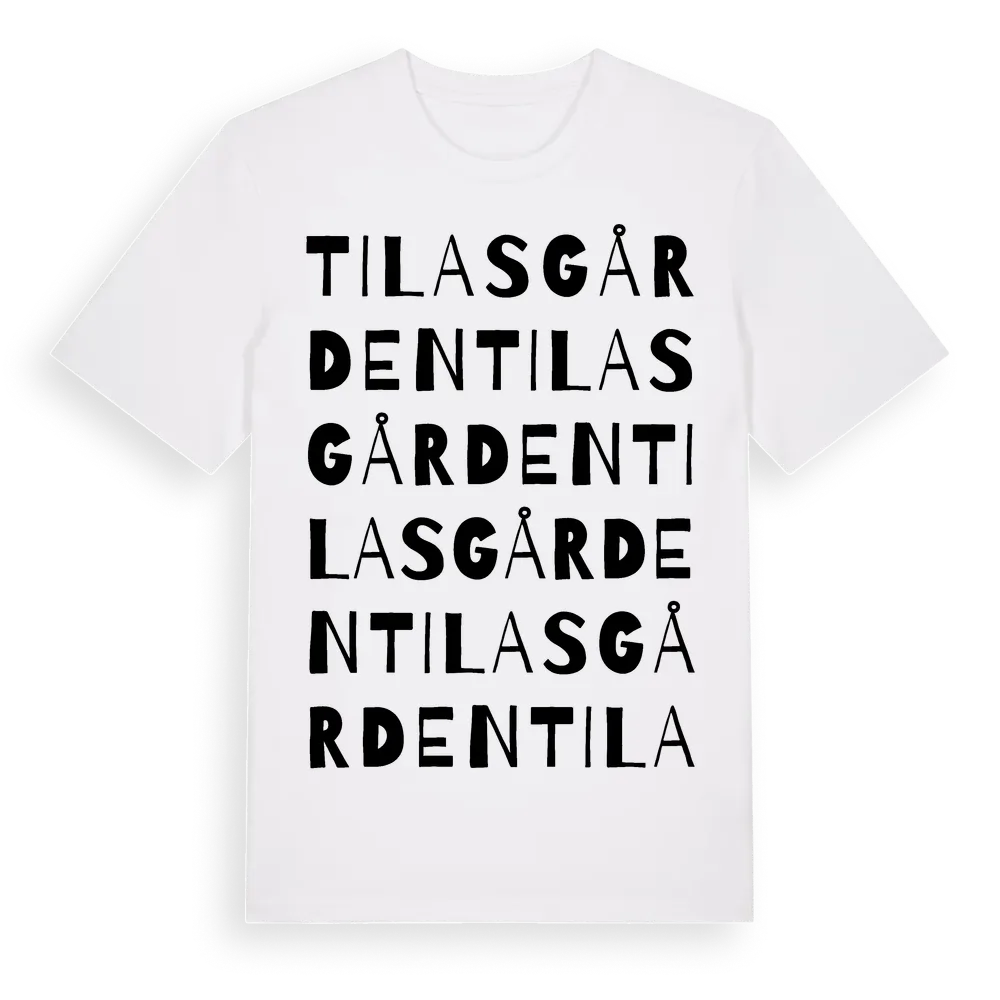Tilasgården ordlek t-shirt är inspirerad av Tilasgården i Uppsala län, Sverige. Tröjan är designad för dig som har en speciell koppling till platsen – oavsett om du bor här, har rötterna här eller bara älskar Tilasgården.