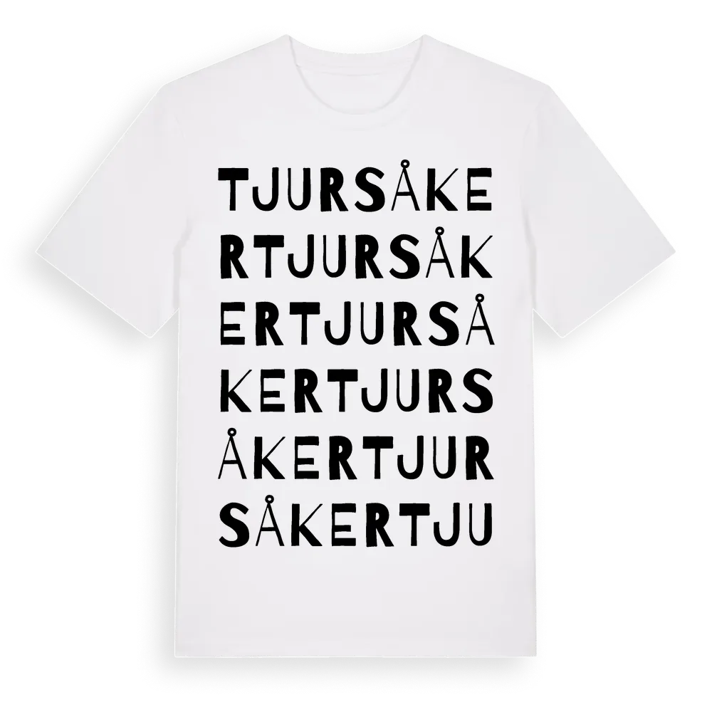 Tjursåker ordlek t-shirt är inspirerad av byn Tjursåker i Uppsala län, Sverige. Tröjan är designad för dig som har en speciell koppling till platsen – oavsett om du bor här, har rötterna här eller bara älskar Tjursåker.