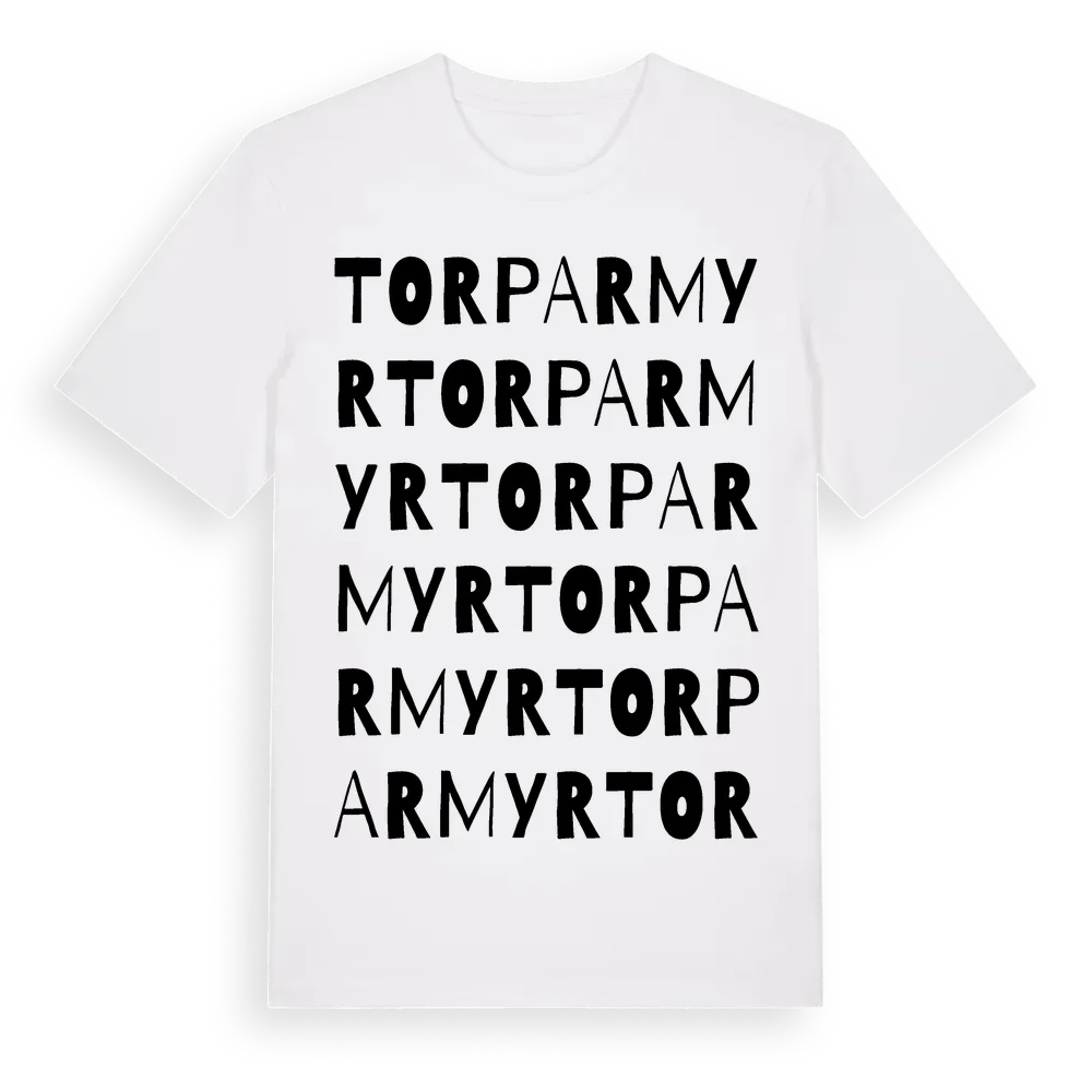 Torparmyr ordlek t-shirt är inspirerad av Torparmyr i Uppsala län, Sverige. Tröjan är designad för dig som har en speciell koppling till platsen – oavsett om du bor här, har rötterna här eller bara älskar Torparmyr.