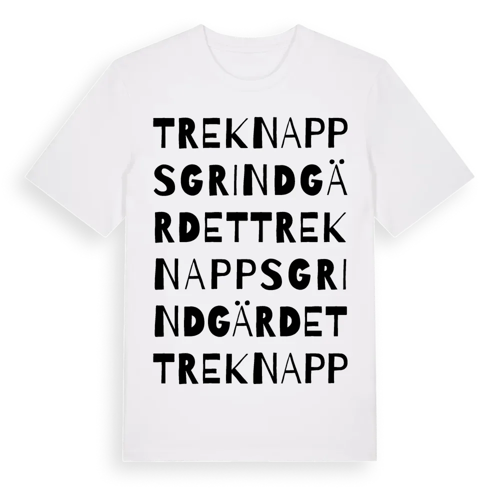 Treknappsgrindgärdet ordlek t-shirt är inspirerad av Treknappsgrindgärdet i Uppsala län, Sverige. Tröjan är designad för dig som har en speciell koppling till platsen – oavsett om du bor här, har rötterna här eller bara älskar Treknappsgrindgärdet.
