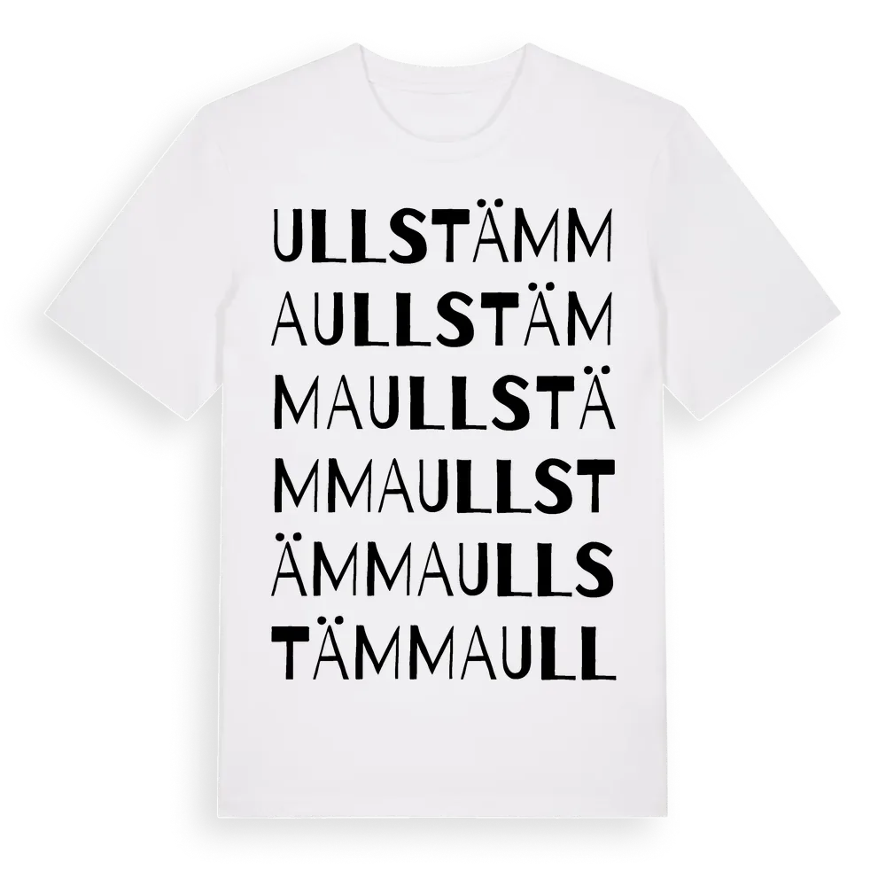Ullstämma ordlek t-shirt är inspirerad av byn Ullstämma i Uppsala län, Sverige. Tröjan är designad för dig som har en speciell koppling till platsen – oavsett om du bor här, har rötterna här eller bara älskar Ullstämma.
