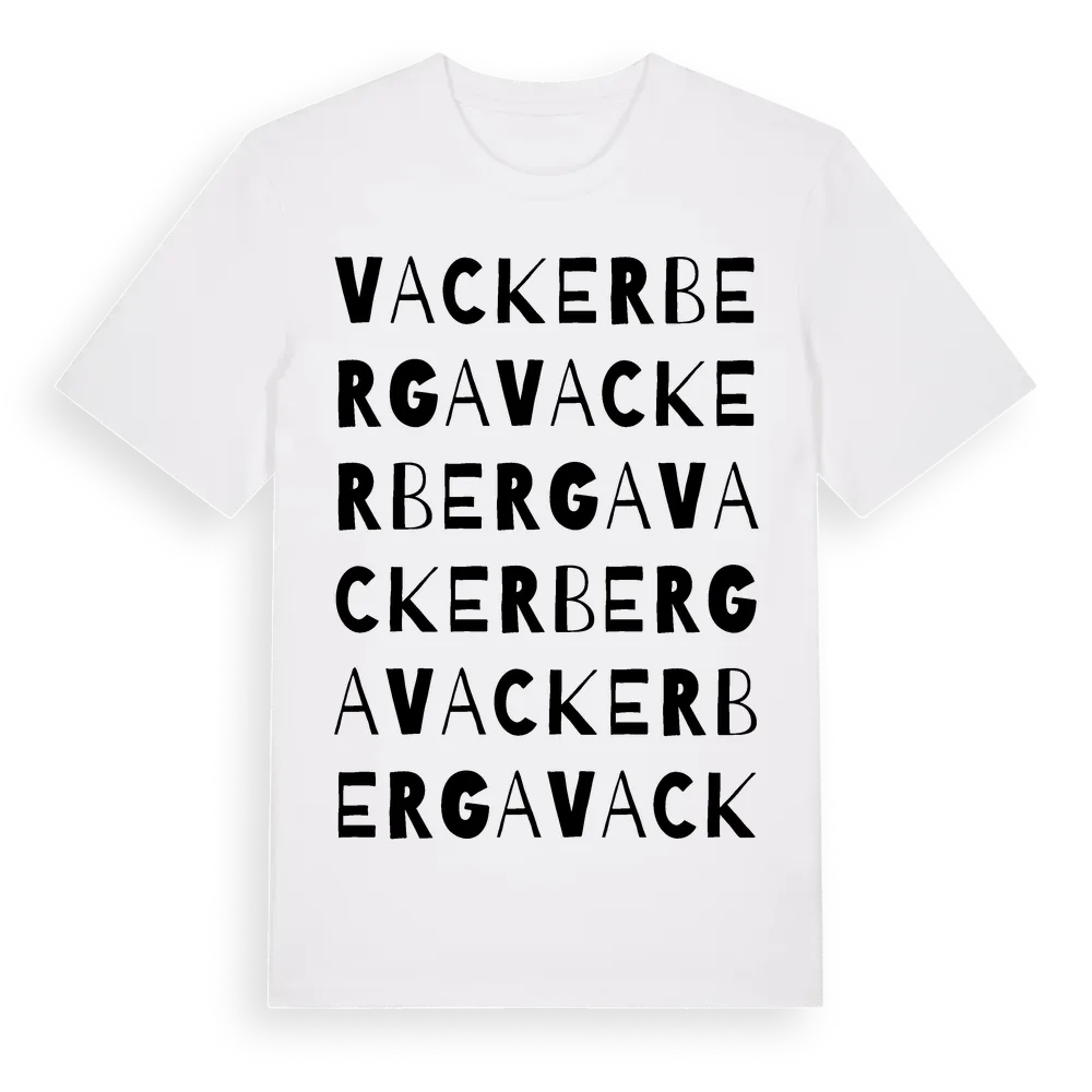Vackerberga ordlek t-shirt är inspirerad av Vackerberga i Uppsala län, Sverige. Tröjan är designad för dig som har en speciell koppling till platsen – oavsett om du bor här, har rötterna här eller bara älskar Vackerberga.
