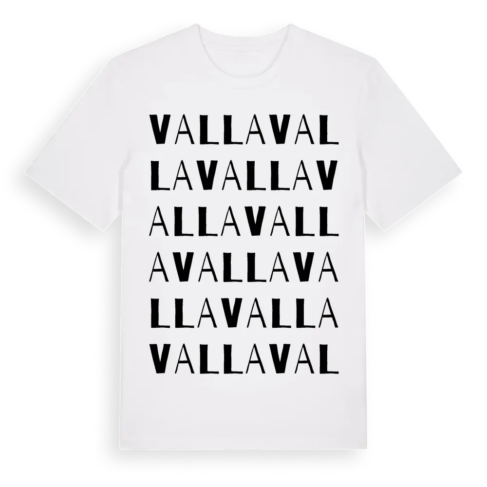 Valla ordlek t-shirt är inspirerad av Valla i Uppsala län, Sverige. Tröjan är designad för dig som har en speciell koppling till platsen – oavsett om du bor här, har rötterna här eller bara älskar Valla.