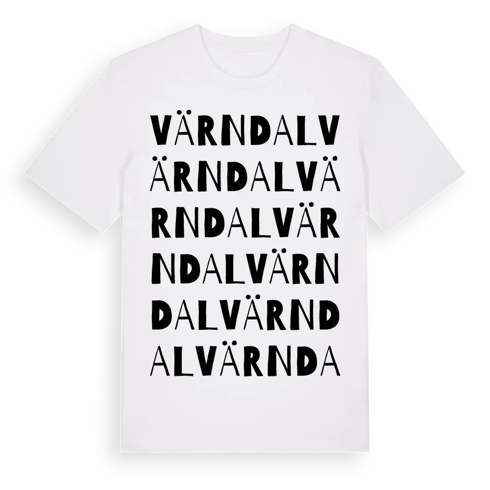 Värndal ordlek t-shirt är inspirerad av Värndal i Uppsala län, Sverige. Tröjan är designad för dig som har en speciell koppling till platsen – oavsett om du bor här, har rötterna här eller bara älskar Värndal.
