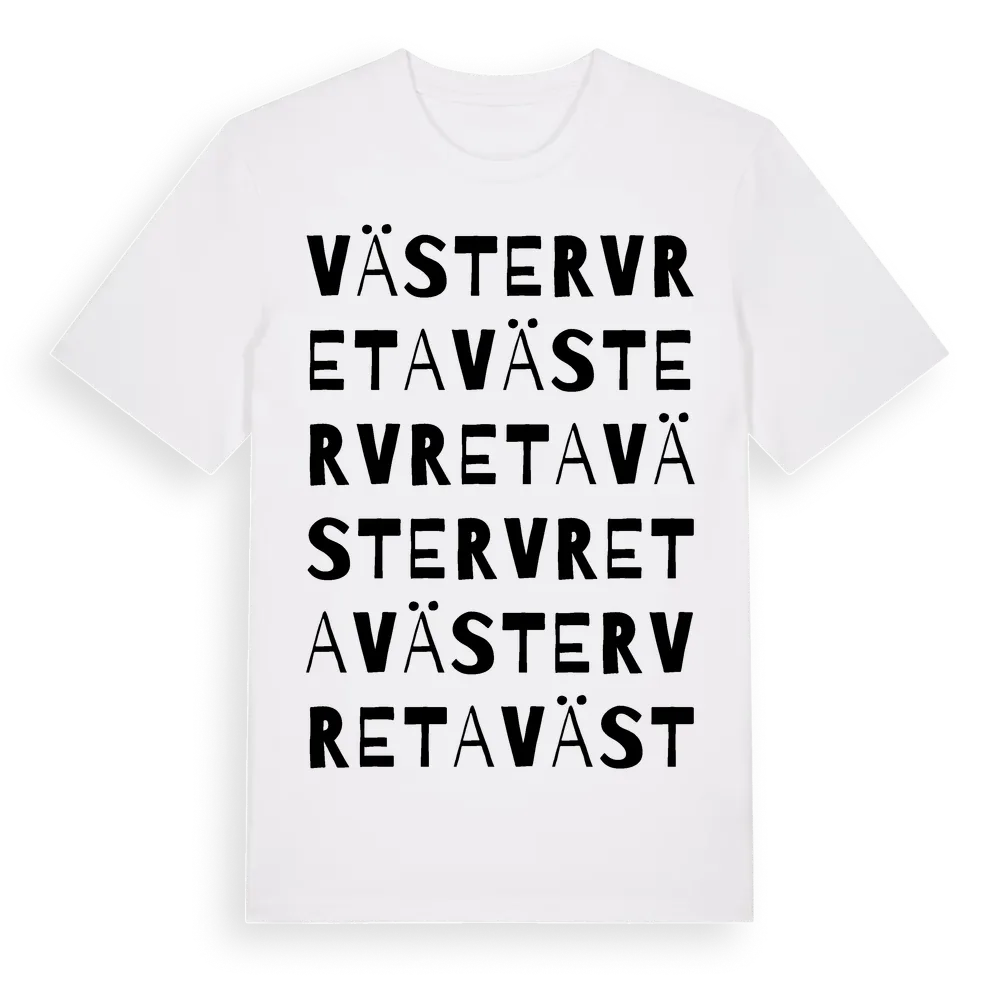Västervreta ordlek t-shirt är inspirerad av Västervreta i Uppsala län, Sverige. Tröjan är designad för dig som har en speciell koppling till platsen – oavsett om du bor här, har rötterna här eller bara älskar Västervreta.
