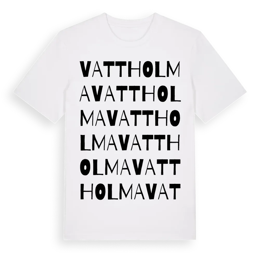 Vattholma ordlek t-shirt är inspirerad av byn Vattholma i Uppsala län, Sverige. Tröjan är designad för dig som har en speciell koppling till platsen – oavsett om du bor här, har rötterna här eller bara älskar Vattholma.