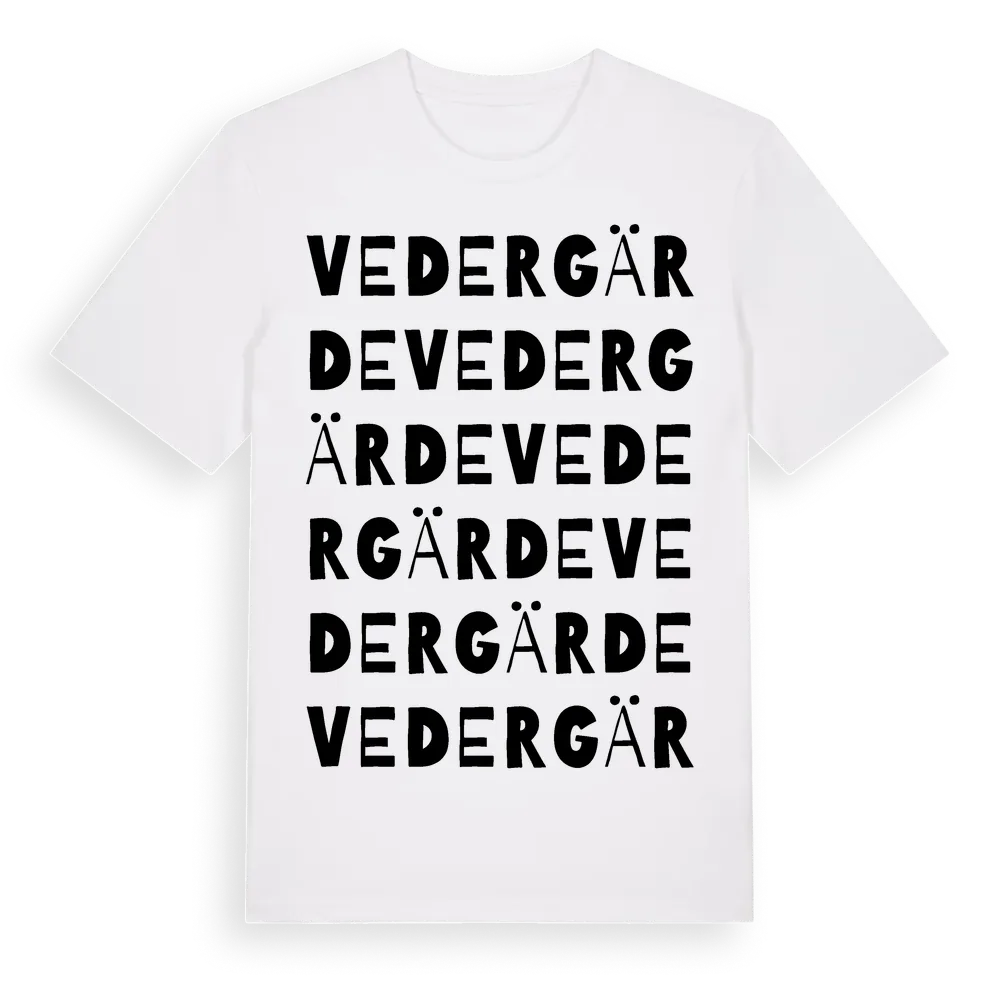Vedergärde ordlek t-shirt är inspirerad av byn Vedergärde i Uppsala län, Sverige. Tröjan är designad för dig som har en speciell koppling till platsen – oavsett om du bor här, har rötterna här eller bara älskar Vedergärde.