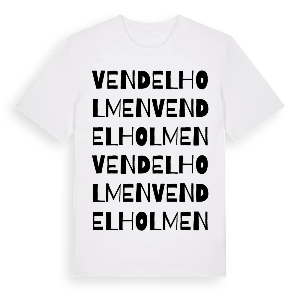 En ordlek byggd på Vendelholmens namn. Subtilt och klurig – ett motiv som bara de som verkligen känner platsen fullt ut förstår. Premium bomull, unisex – från Vendelholmen i Uppsala län.